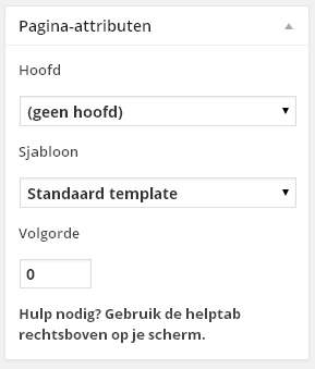 Maar wat is een pagina template/sjabloon? Als je naar één van je website pagina’s in het administratie gedeelte van WordPress gaat, zie je meestal aan de rechterkant (soms kan het ook onder de wysiwyg editor staan) de “Pagina-attributen“.